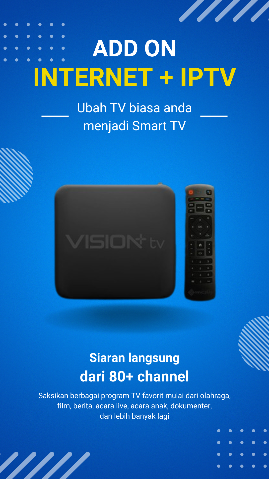 Dapatkan pengalaman menonton televisi yang lebih lengkap dan menyenangkan dengan tambahan IPTV dalam paket internet rumah kami! Nikmati ratusan channel TV dari seluruh dunia, termasuk channel olahraga, film, musik, berita, dan banyak lagi, semua dapat diakses dengan cepat dan mudah melalui layanan IPTV kami.